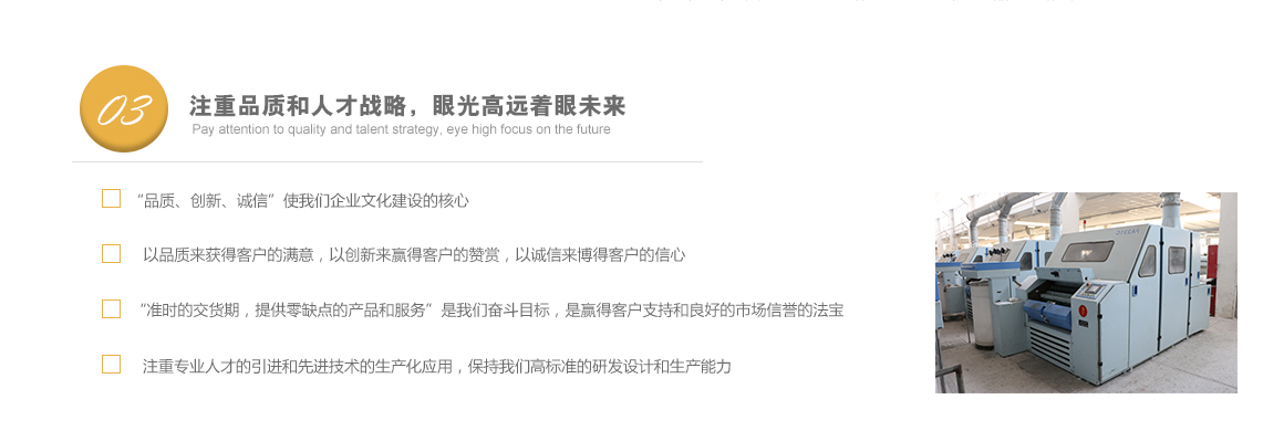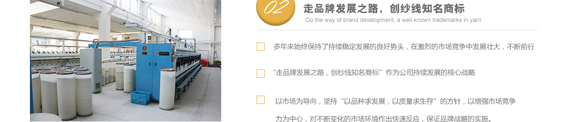太倉市高陽工貿(mào)有限公司是專業(yè)從事特種紗生產(chǎn)十?dāng)?shù)年的一線生產(chǎn)廠家,坐落于江蘇省蘇州市太倉市雙鳳鎮(zhèn)新湖建湖路29號(hào),太倉隸屬長江三角洲經(jīng)濟(jì)圈,交通便捷,經(jīng)濟(jì)發(fā)達(dá),是著名的紡織生產(chǎn)基地。 公司歷史要追溯到1982年就成立的新湖毛紡織廠。1996年,毛紡織廠與上海二十二棉在新湖聯(lián)合組建了太倉市新湖福利綜合廠。2002年為適應(yīng)市場的飛速變化,公司轉(zhuǎn)制重組更名為太倉市高陽工貿(mào)有限公司。同時(shí)公司適時(shí)調(diào)整生產(chǎn)經(jīng)營策略,調(diào)整產(chǎn)品品種結(jié)構(gòu),把生產(chǎn)特種紗作為主要發(fā)展方向,純棉、滌綸竹節(jié)紗是我們的主要產(chǎn)品。 公司多年來始終保持了持續(xù)穩(wěn)定發(fā)展的良好勢頭,在激烈的市場競爭中發(fā)展壯大,不斷前行。我們把“走品牌發(fā)展之路,創(chuàng)紗線知名商標(biāo)”作為公司持續(xù)發(fā)展的核心戰(zhàn)略。以市場為導(dǎo)向,堅(jiān)持“以品種求發(fā)展,以質(zhì)量求生存”的方針,以增強(qiáng)市場競爭力為中心,對(duì)不斷變化的市場環(huán)境作出快速反應(yīng),品牌戰(zhàn)略的實(shí)施。公司注重專業(yè)人才的引進(jìn)和先進(jìn)技術(shù)的生產(chǎn)化應(yīng)用,具備較強(qiáng)的研發(fā)設(shè)計(jì)和生產(chǎn)能力。 公司一直把“品質(zhì)、創(chuàng)新、誠信”作為企業(yè)文化建設(shè)的核心。以品質(zhì)來獲得客戶的滿意,以創(chuàng)新來贏得客戶的贊賞,以誠信來博得客戶的信心。我們把“準(zhǔn)時(shí)的交貨期,提供零缺點(diǎn)的產(chǎn)品和服務(wù)”作為奮斗目標(biāo),贏得了客戶的支持和良好的市場信譽(yù)。 高陽工貿(mào)有限公司愿與廣大客戶加強(qiáng)合作,共享信息,迎接挑戰(zhàn),共同發(fā)展。客戶需求。了解詳細(xì)>>